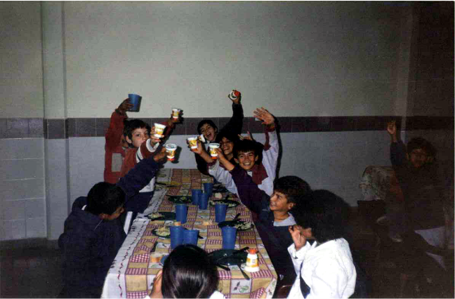 La escuela Justiniano Frías, prestaba sus instalaciones, y allí se preparaba la comida “con leña”, y los niños recibían el almuerzo diario, para lo cual traían platos y cubiertos de sus casas.